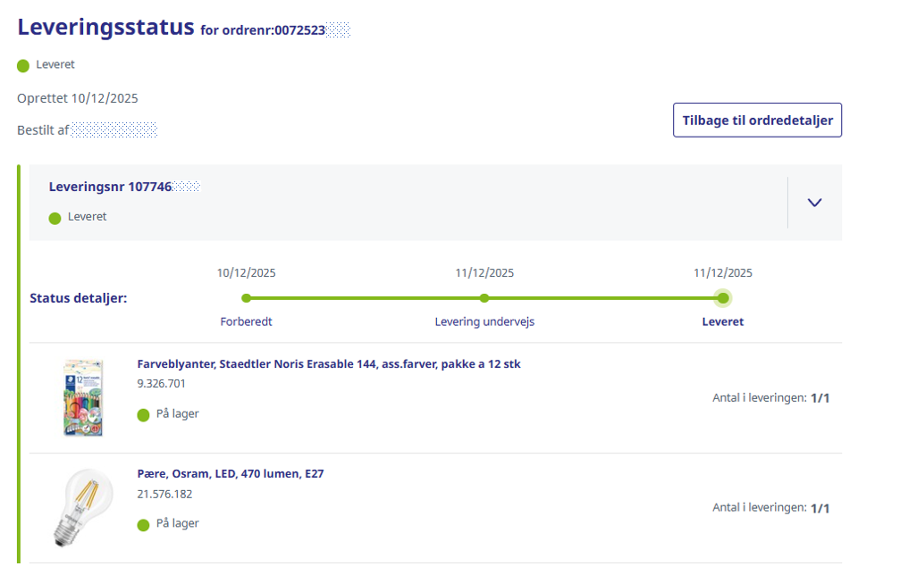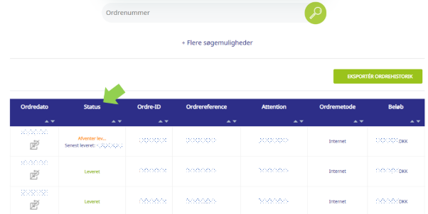 - Efter at have fundet den ordre, som du ønsker at se detaljer for, kan du under status finde frem til, hvor langt ordren er i forløbet.