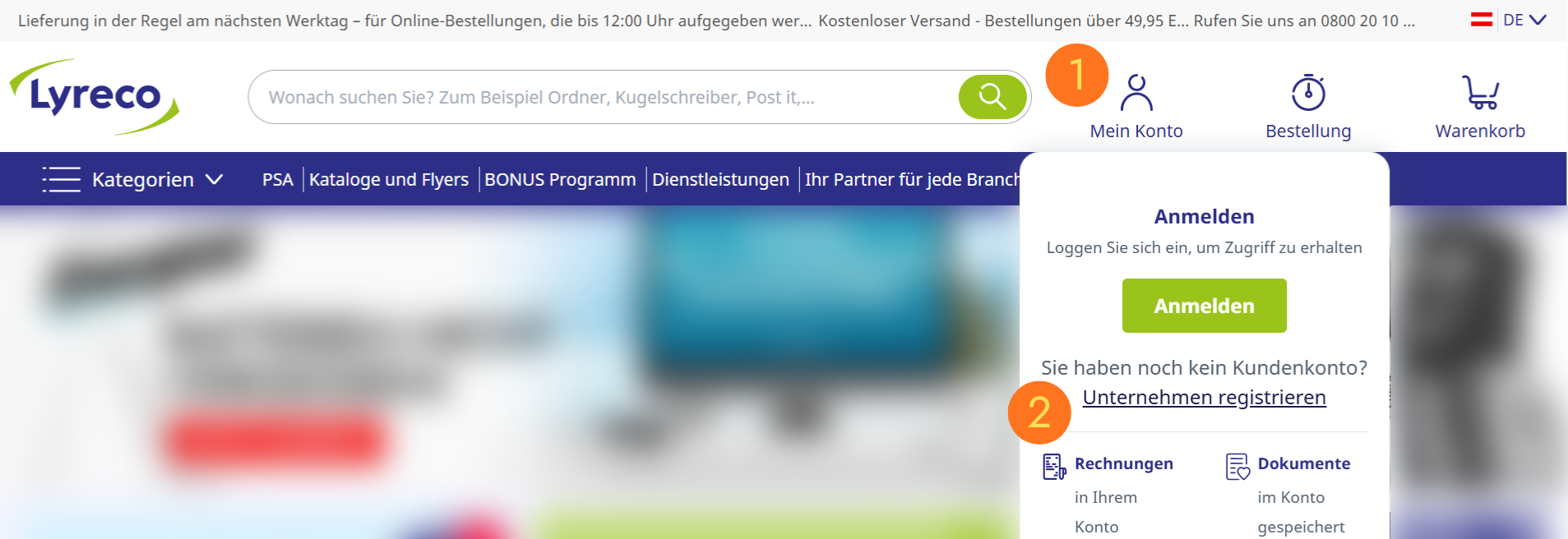 Bewegen Sie den Mauszeiger oben rechts im Lyreco Webshop auf Mein Konto und klicken Sie anschließend auf Unternehmen registrieren.