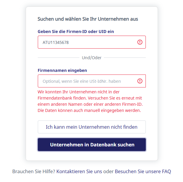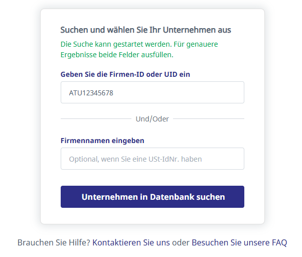 Suchen Sie Ihr Unternehmen anhand seiner ATU-Nummer oder Ihres Firmennamens.