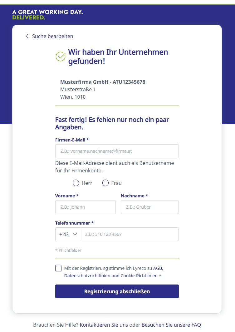 - Akzeptieren Sie die Allgemeinen Geschäftsbedingungen, die Datenschutzerklärung und die Cookie-Richtlinie von Lyreco.