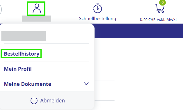 - Melden Sie sich im Webshop an und navigieren Sie zu Ihrem Profil und dann zu Bestellhistory.