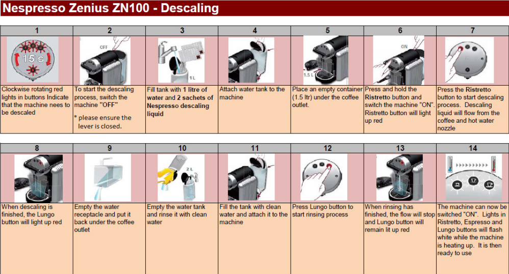 - Fill the water tank with 1 litre of water and 2 sachets of Nespresso descaling liquid.