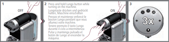 - Press and hold the Lungo button while turning the machine to 'ON'.