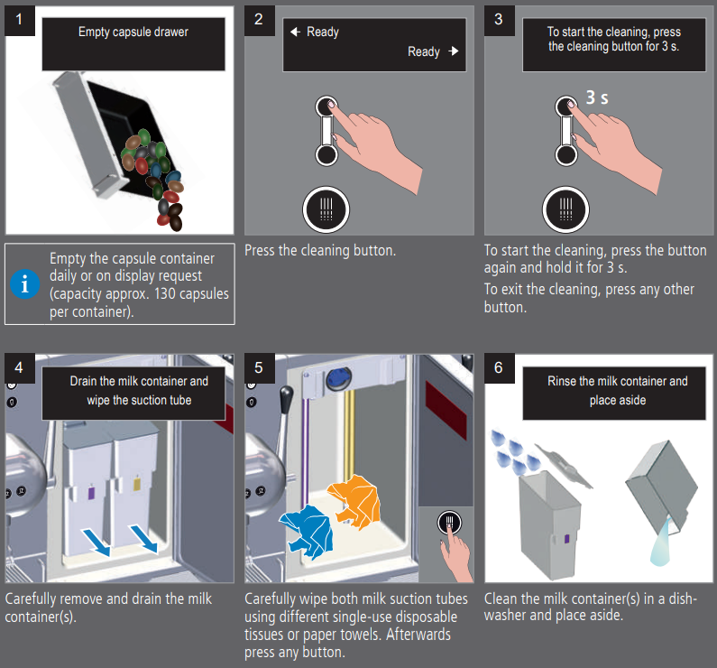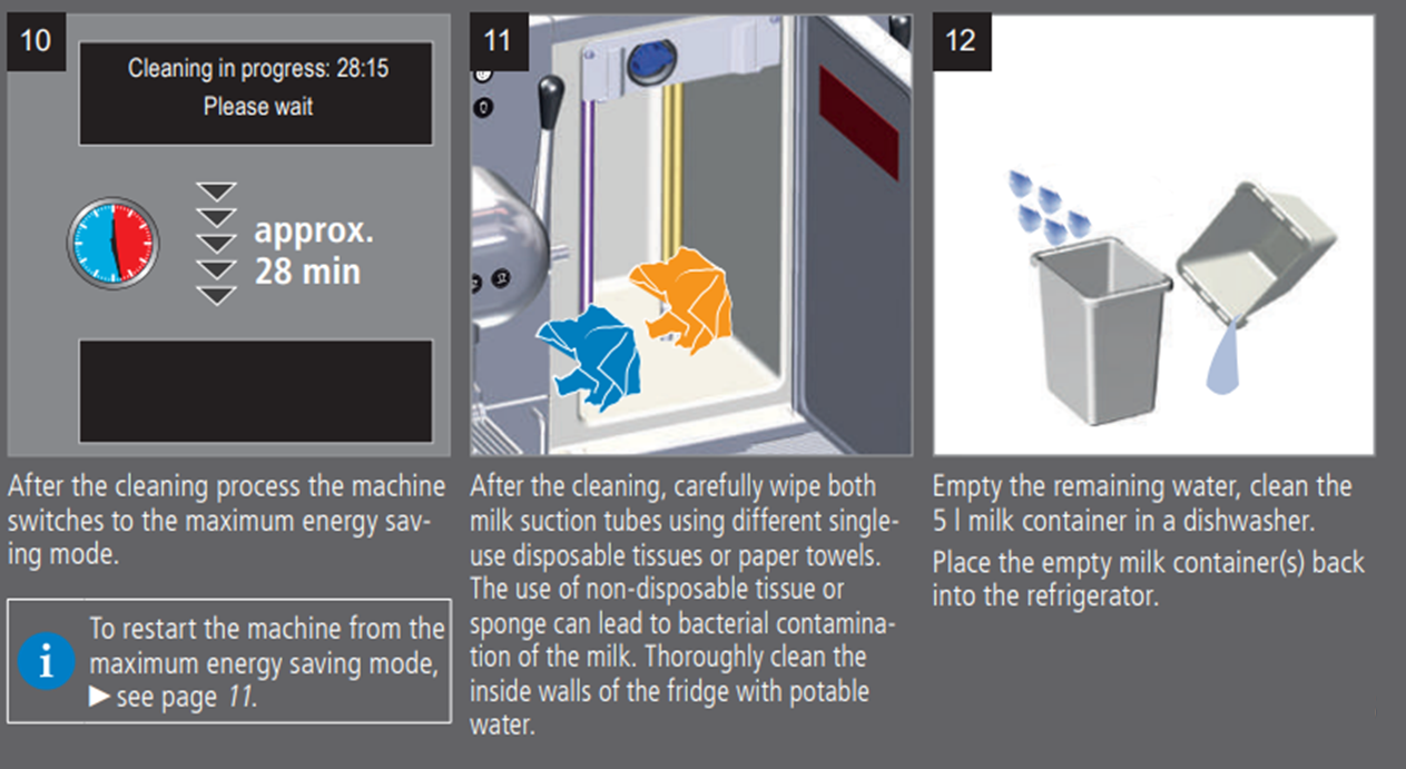 - Clean the milk container(s) in a dishwasher and place aside.