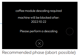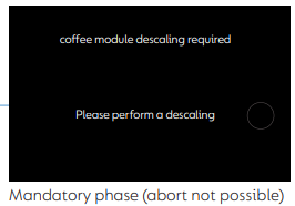 If descaling is not performed during the recommended phase, the machine enters mandatory phase and becomes blocked. The only way to unblock it is to perform a descaling as describe below.