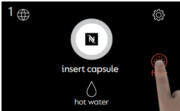 Clean the water tank every time you change the filter. After installing a new filter, the machine will automatically run a rinsing cycle that flushes approximately 0.5 liters of water through the outlets. Place a container with at least this capacity under the outlets before starting.