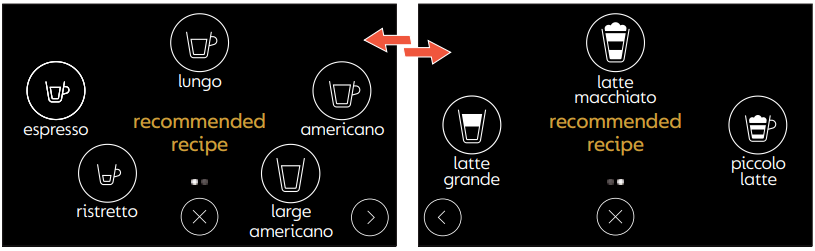 Setting 7 to 10 recipes: You must set 5 recipes on the first recommendations screen. One of the recipes must be a “pure coffee” recipe. On the second recommendation screen, set up to 5 more recipes of your choice.