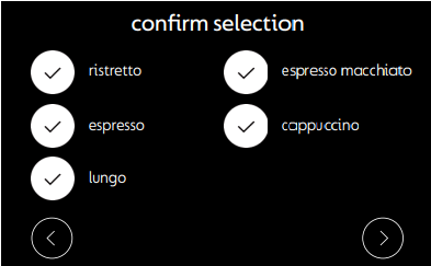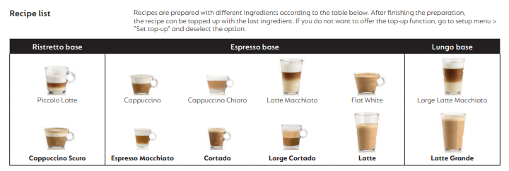 - Setting 3 to 6 recipes: You must set a minimum of 3 recipes. One of the recipes must be a “pure coffee” recipe (either ristretto, espresso or lungo).