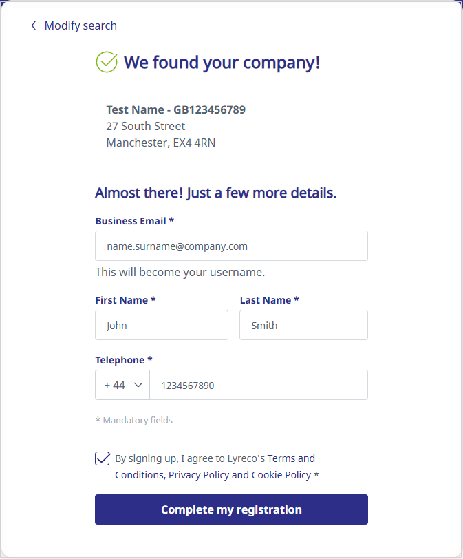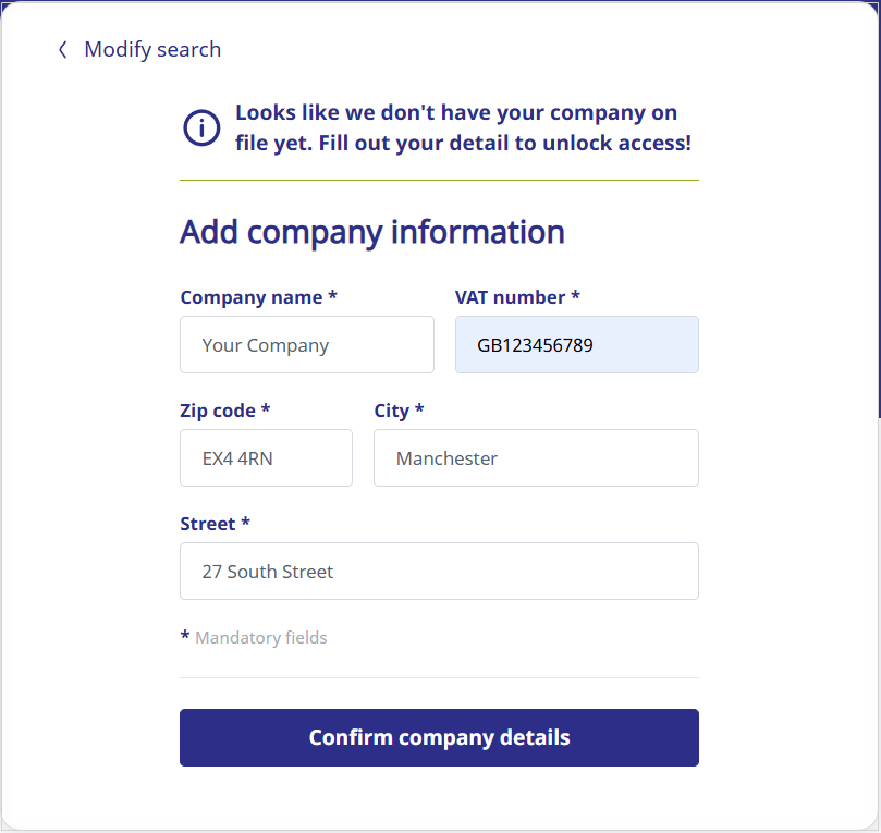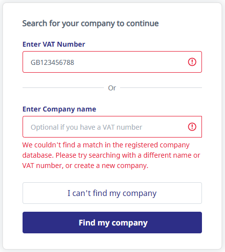 If your company isn’t found, select I can’t find my company to enter the details manually.