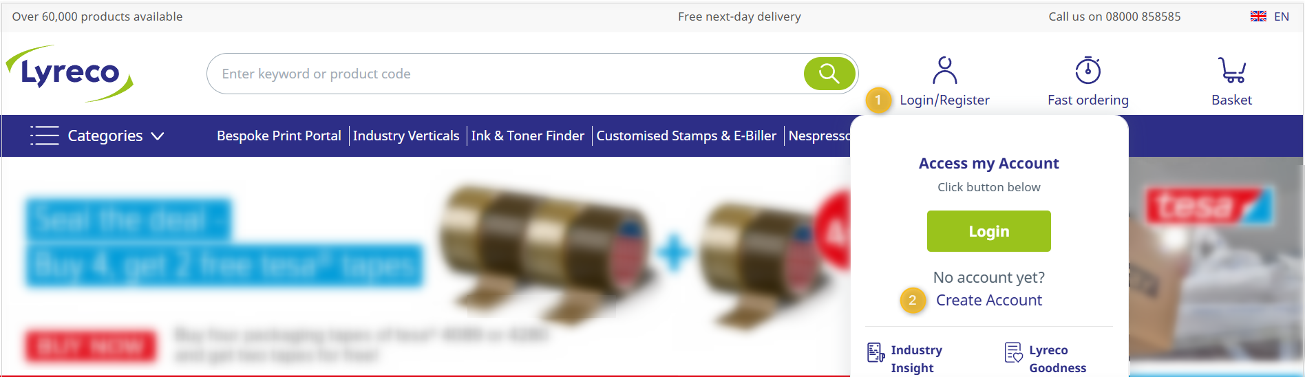 At the top right of the Lyreco Webshop, hover over Login/Register, then select Create Account.