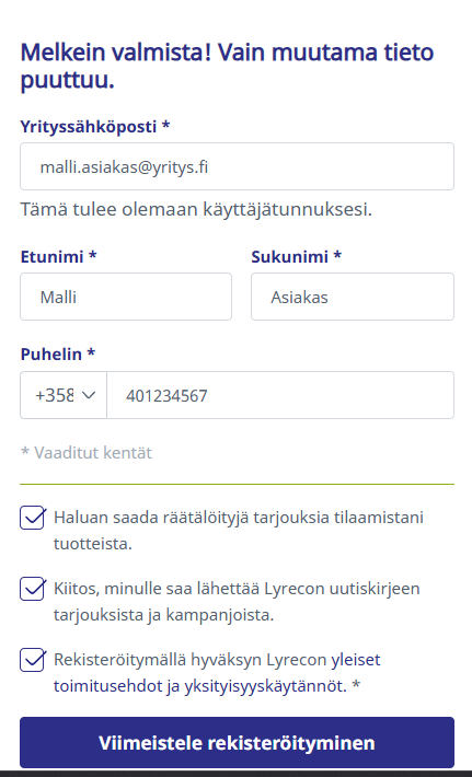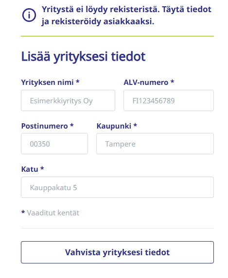 Huom. Jos y-tunnus löytyy jo järjestelmästämme, rekisteröinti ei onnistu. Ole tässä tapauksessa yhteydessä asiakaspalveluumme soittamalla tai chatissä.