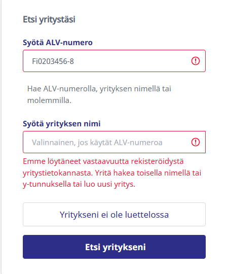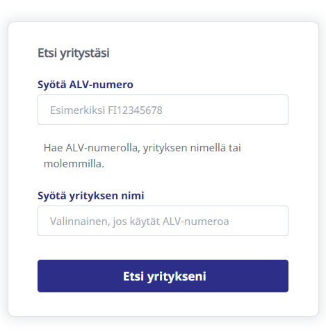 Tarvitset rekisteröityäksesi voimassa olevan y-tunnuksen. Voit hakea yritystä ALV numerolla, yrityksen nimellä tai molemmilla.