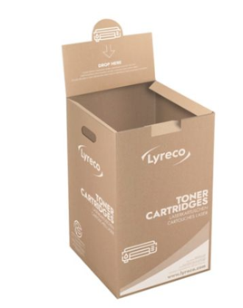 Laatikkoon mahtuu maksimissaan 15-20 laservärikasettia. Kierrätyslaatikkoon saa laittaa alkuperäisen valmistajan (HP, Lexmark, Brother, Canon ym.), Lyreco tai Wecare-värikasetit: Laservärikasetit, mustesuihkupatruunat, rummut, kuvansiirtoyksiköt ja postimaksukoneiden värit.