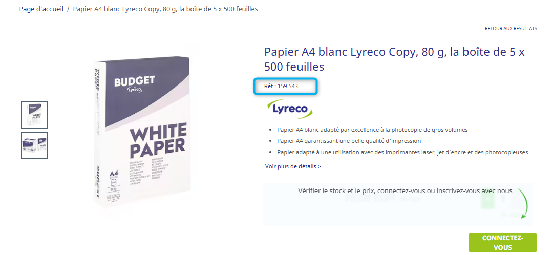 - Sur le Lyreco Webshop : Tu peux trouver les codes produits sur la page liste des produits ou sur la page du produit.
