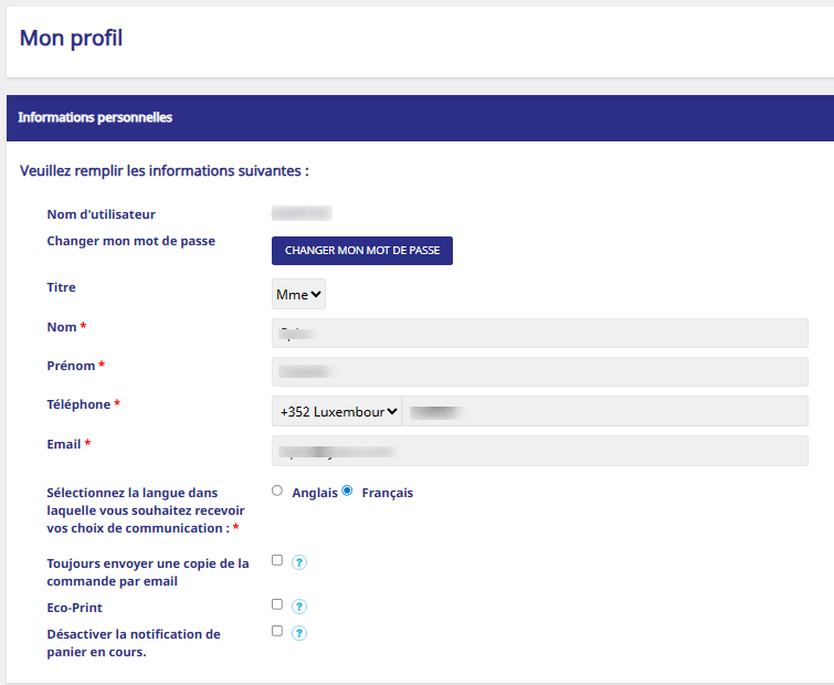Vous pouvez mettre à jour vos informations personnelles, telles que votre nom, votre adresse e-mail ou votre numéro de téléphone, directement dans votre compte Lyreco Webshop.