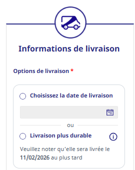 Les commandes passées après 17h30 sont livrées dans les 2 jours ouvrables. - Choisissez la date de livraison : Sélectionnez une date de livraison jusqu’à 14 jours à l’avance.