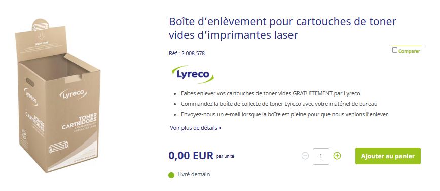 Commandez une boîte de recyclage gratuite (code produit 2.008.578) via le Webshop Lyreco ou en contactant notre Service Client.
