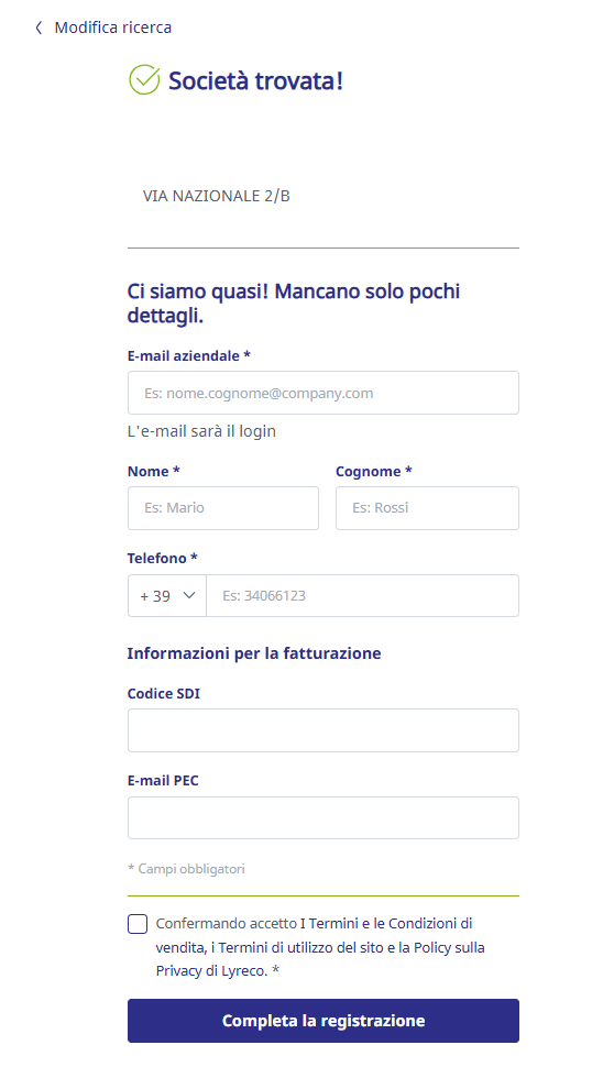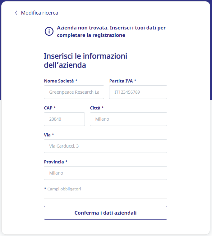 Se la tua azienda non viene trovata, seleziona Non trovo la mia Società per inserire i dettagli manualmente: