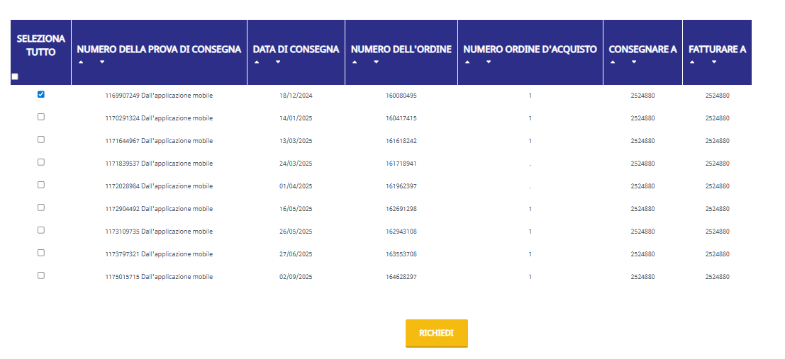 Seleziona la prova di consegna necessaria e clicca su RICHIEDI.