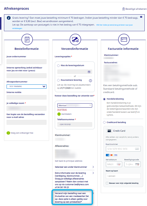 Indien u uitzonderlijk wenst dat uw bestelling naar een ander adres wordt verzonden, heeft u de mogelijkheid om uw bestelling naar een thuisadres te laten leveren.