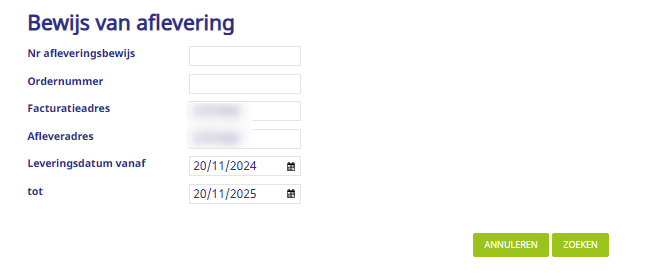 Zoek het leveringsbewijs op via leveringsnummer, bestelnummer of datumbereik en klik vervolgens op ZOEKEN.