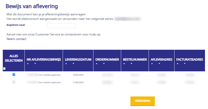 Vink het vakje aan van het gewenste leveringsbewijs en klik op VERZENDEN.