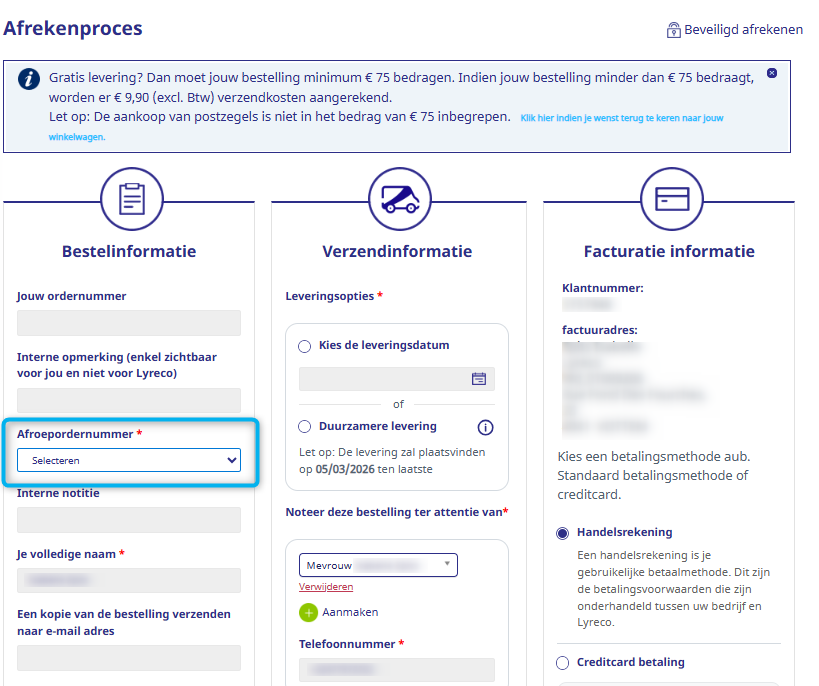 Als dit veld verplicht is maar leeg blijft, of als je afroepordernummer niet in de lijst verschijnt, neem dan contact op met je aankoopdienst of boekhouding om het jaarlijkse open bestelnummer te verkrijgen.