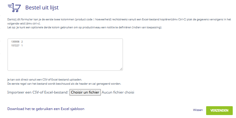 Bestel uit lijst: u kunt de productcodes en aantallen kopiëren en plakken of uw lijst rechtstreeks uploaden in XLS- of CSV-formaat. Klik daarna op VERZENDEN.
