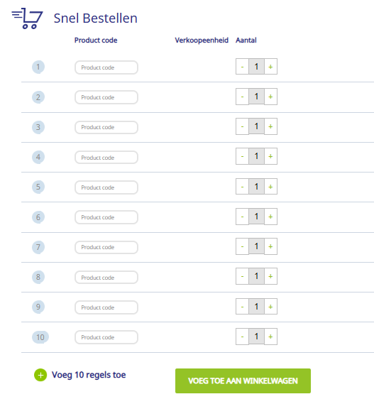 Snel bestelformulier : u kunt handmatig de productcodes en aantallen toevoegen.