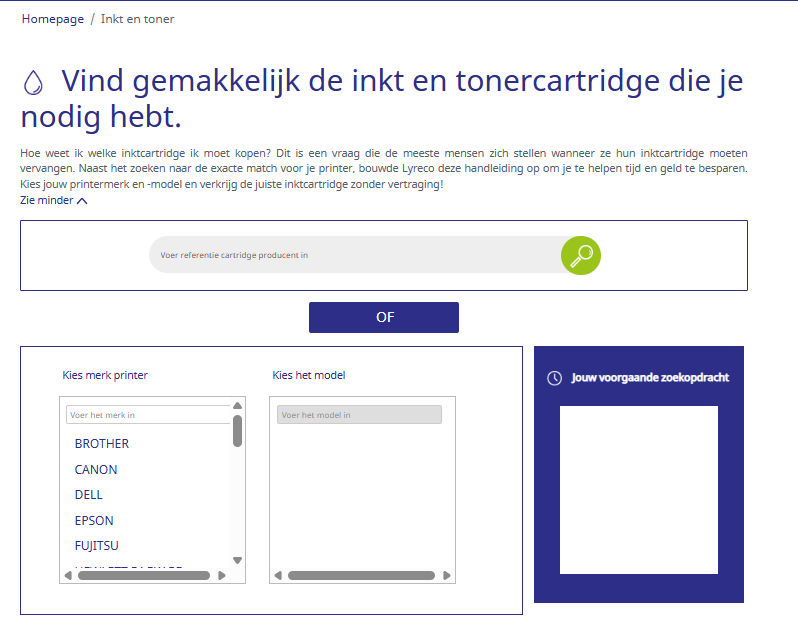 - Voer het productnummer van uw oude cartridge in in de zoekbalk. Dit nummer staat op de originele verpakking of op de cartridge zelf.