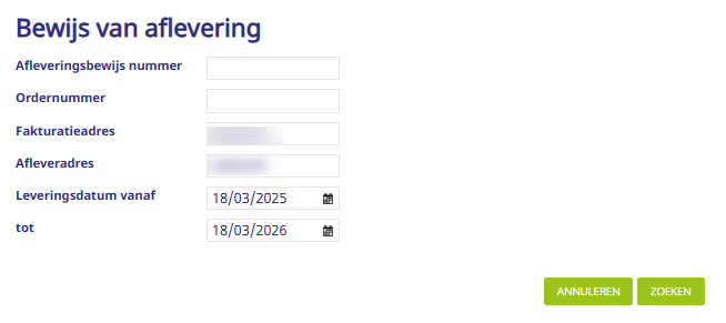 Zoek het leveringsbewijs op via leveringsnummer, bestelnummer of datumbereik en klik vervolgens op ZOEKEN.