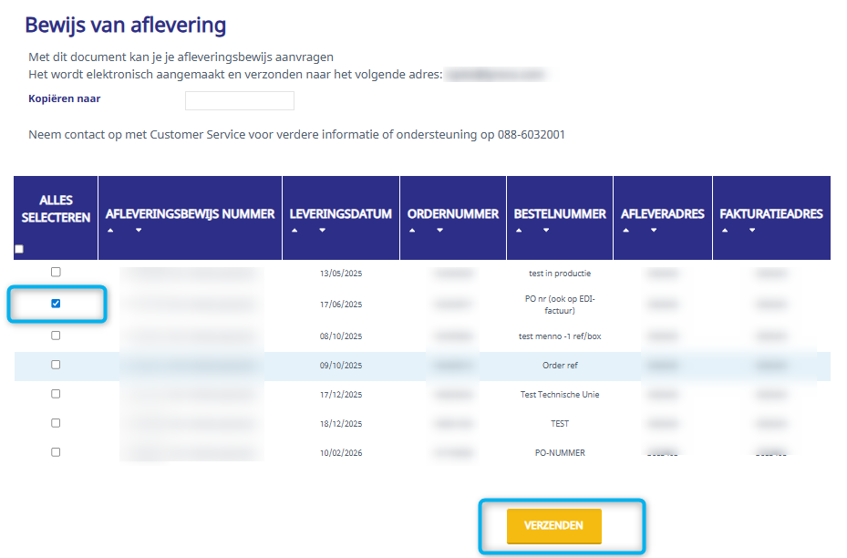 Vink het vakje aan van het gewenste leveringsbewijs en klik op VERZENDEN.