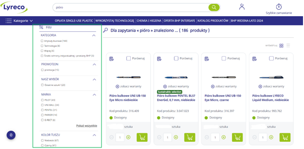 Po wyszukaniu słowa kluczowego, np. "pióro", można dostosować wyniki wyszukiwania produktów, korzystając z opcji filtrowania znajdujących się w sekcji "Filtr" po lewej stronie okna wyszukiwania. Pozwala to na zastosowanie filtrów opartych na różnych kryteriach, takich jak kategoria, promocje, marka i sustainable selection.