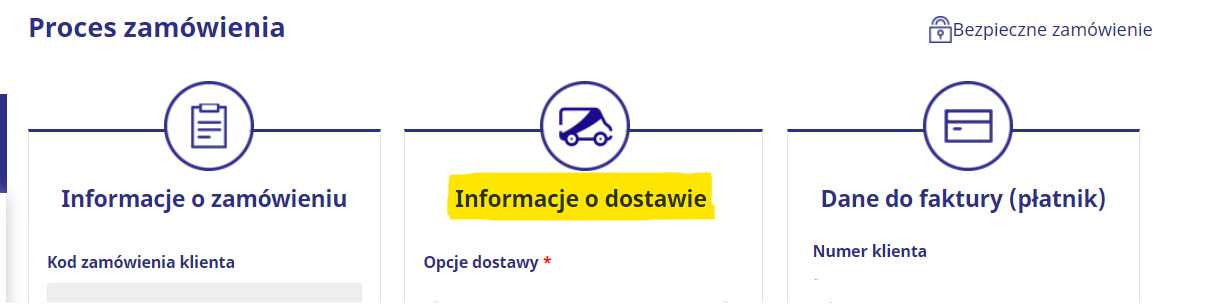 - W kolumnie "Informacje o dostawie" funkcja "Zmiana adresu dostawy / zamawiam dostawę w miejsce pracy zdalnej" umożliwia wprowadzenie dowolnego adresu na terenie Polski w celu dostarczenia zamówienia: